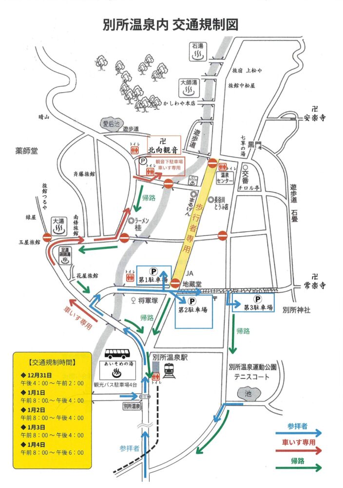北向観音の初詣に合わせて、別所温泉では交通規制が行われます。