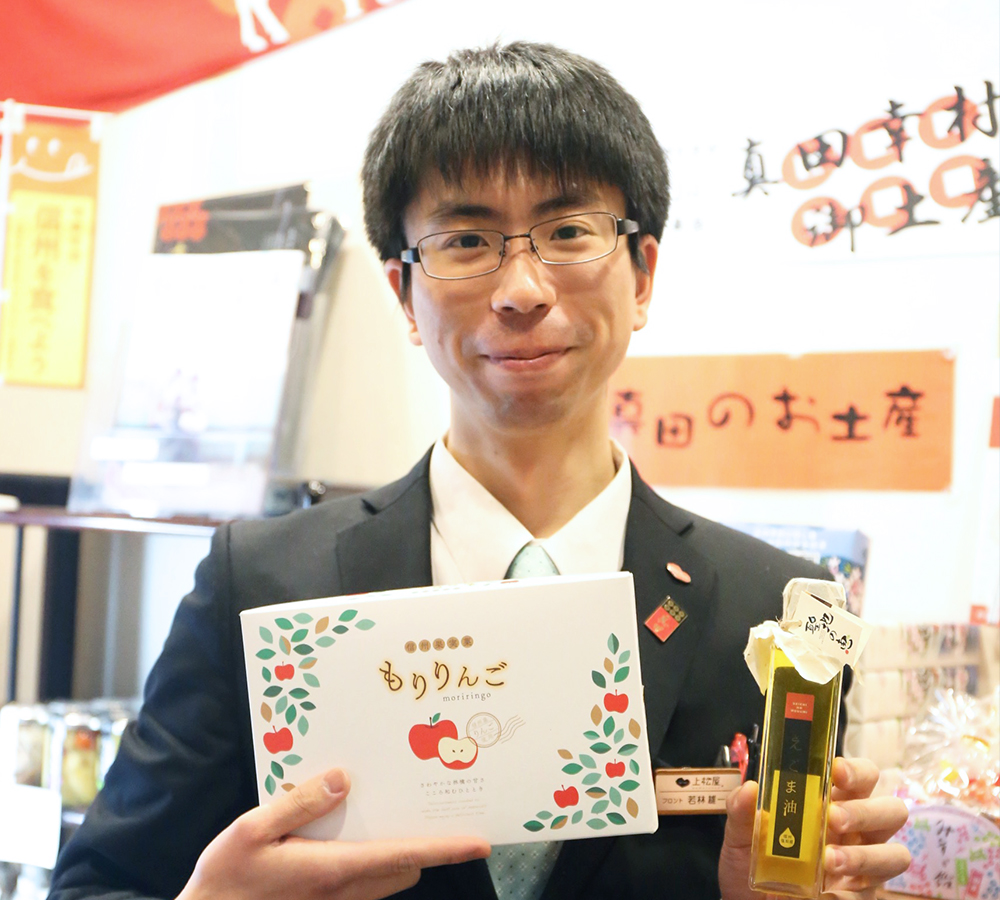 フロント業務の傍ら、入社間もない頃から担当しているのが売店の仕事。この売店では、当館のコンセプト「地産地消」にならい、上田を中心とした長野県産の商品を取り揃えています。上田産の松茸やうえだみどり大根といった農産物から、地元の農場オリジナルの豆菓子、別所温泉のオリジナルブランド『聖地の恵』関連商品など、どれも地元だから買えるものばかり。自分が「おいしい」「買って帰りたい」と思えるものを仕入れ、お客様に手に取っていただけることは、何よりの励みになります。